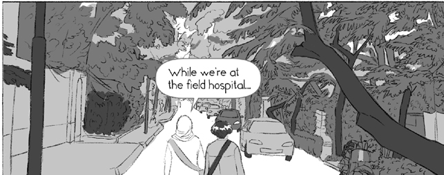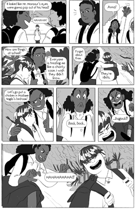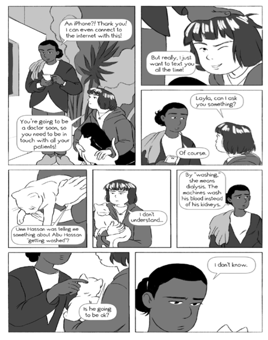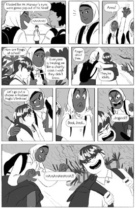 Collaboration between the story writers and artists was especially challenging when changes were made to the script. In earlier drafts of Lissa, this scene occurred when the girls were much younger, so Layla would not yet have been of the age when women would start covering their hair. In later drafts, we placed the girls in middle school, but Sherine forgot to update the art directions, so Caroline proceeded to create the page, as on the left (Sorry, Caroline!). When we looked at the public schools in the Maadi neighborhood where Layla would have gone, we saw that most girls in this time period wear scarves with their school uniforms by middle school (the age of the girls in the final drafts). Caroline made the corrections, and the final page (on the right) is what is depicted in the book.