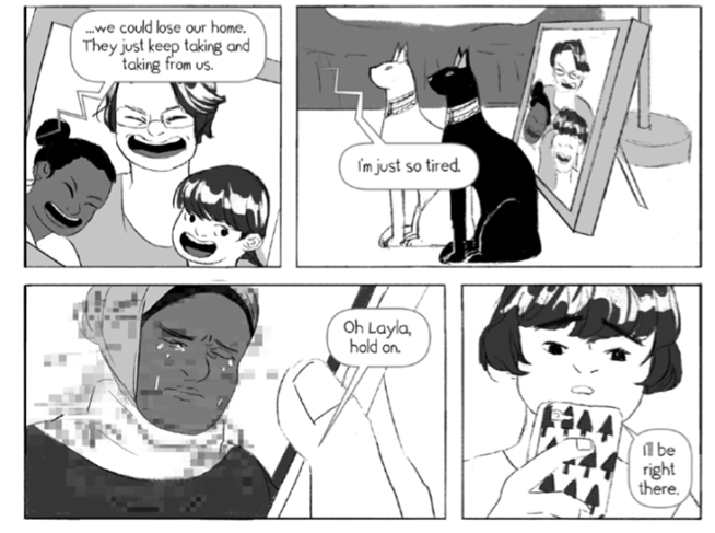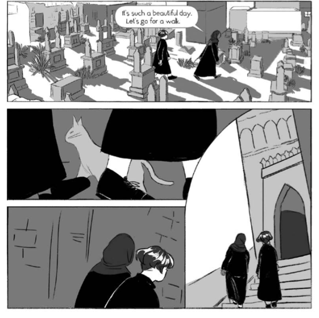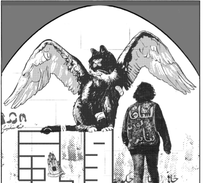 Ganzeer’s “Cat of Defiance” on the final page visually echoes the cats who moved through Anna and Layla’s friendship. In this piece, we also see the cat imagery extend to revolutionary actors: the bandages on the cat’s injured eye reference Ahmed and others who lost their eyes to state violence, and the characteristic wings of martyrdom commemorate those who died for the cause.